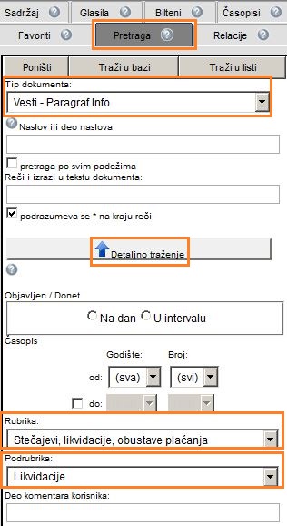 Pretraga > Tip dokumenta: Vesti - Paragraf vesti > Detaljno traženje > Rubrika: Stečajevi, likvidacije, obustave plaćanja