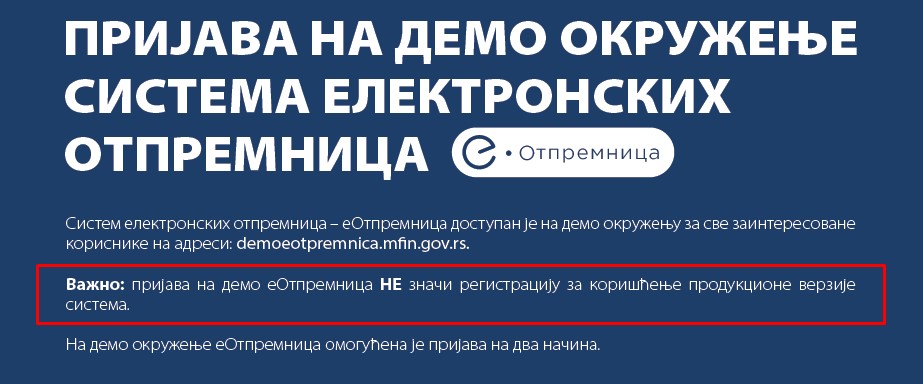 *Prema Službenom glasniku RS , broj 109/2025 - Prevoznik nema obavezu preuzimanja elektronske otpremnice ukoliko je poštanski operator, odnosno davalac poštanskih usluga, za prevoz poštanskih pošiljki, u skladu sa zakonom kojim se uređuju poštanske usluge, ukoliko je sadržina te pošiljke : korespodencija, dokument, knjiga, katalog, novina i/ili časopis.