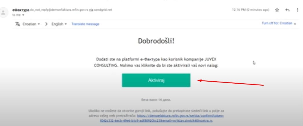 Kada novi korisnik dobije email sa pozivom na aktivaciju naloga, potrebno je da se isti i aktivira.