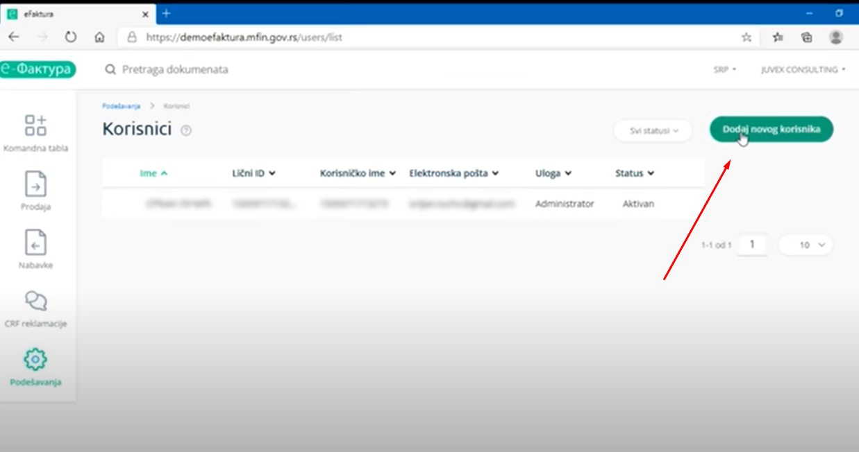 Ukoliko ste uspeli da registrujete kompaniju sa kvalifikovanim elektronskim sertifikatom prethodnog zakonskog zastupnika, u odeljku Podešavanja/Korisnici/Dodaj novog korisnika, možete dodati novog zakonskog zastupnika sa pravima administratora, koji će deaktivirati inicijalnog zakonskog zastupnika kao korisnika SEF promenom statusa korisničke uloge iz Aktivan u Neaktivan.