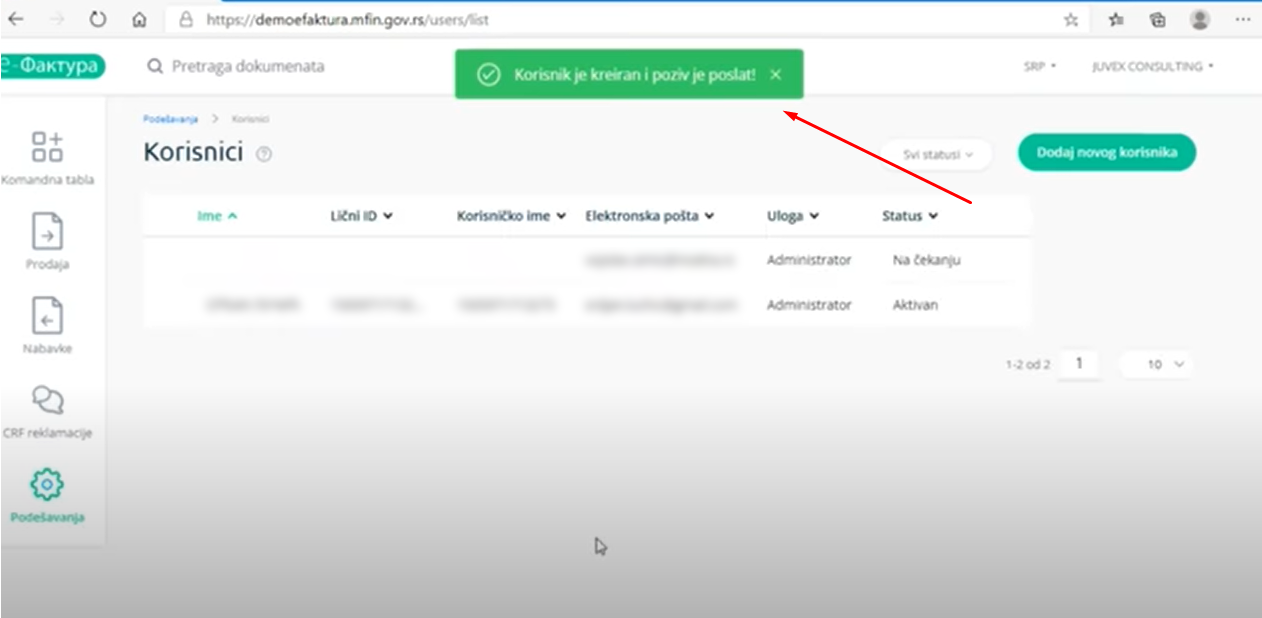 Kada se pošalje poziv klikom na dugme “pošalji poziv” – korisnik je kreiran i poziv je poslat.