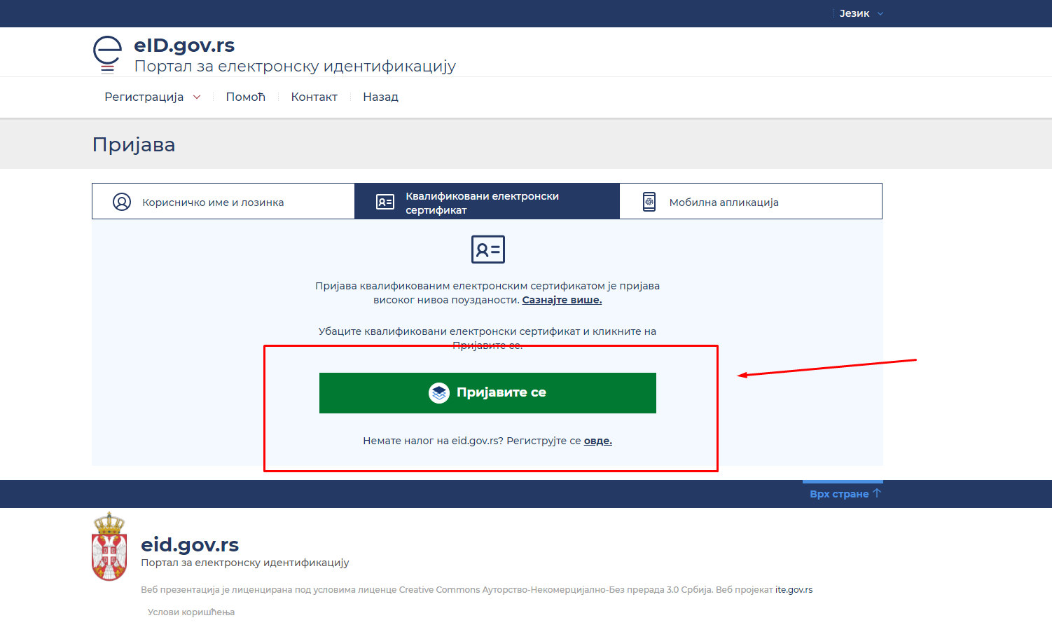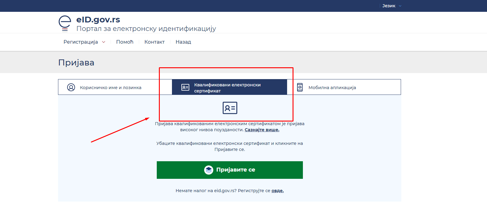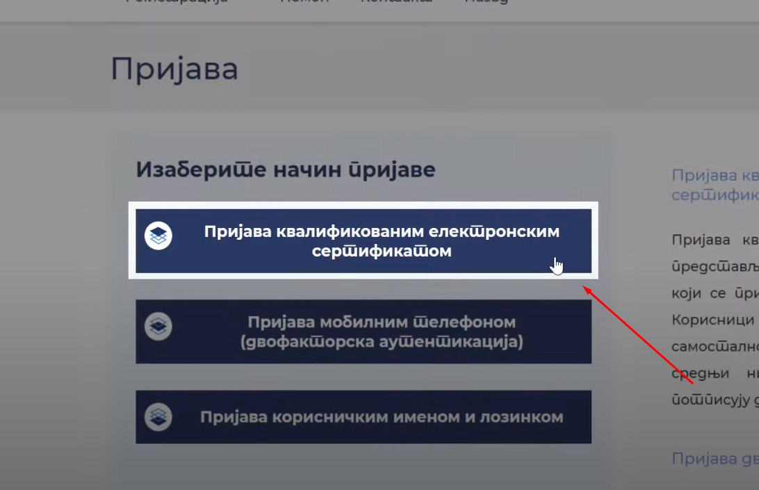 2. Potom izaberite opciju: Prijava kvalifikovanim elektronskim sertifikatom.