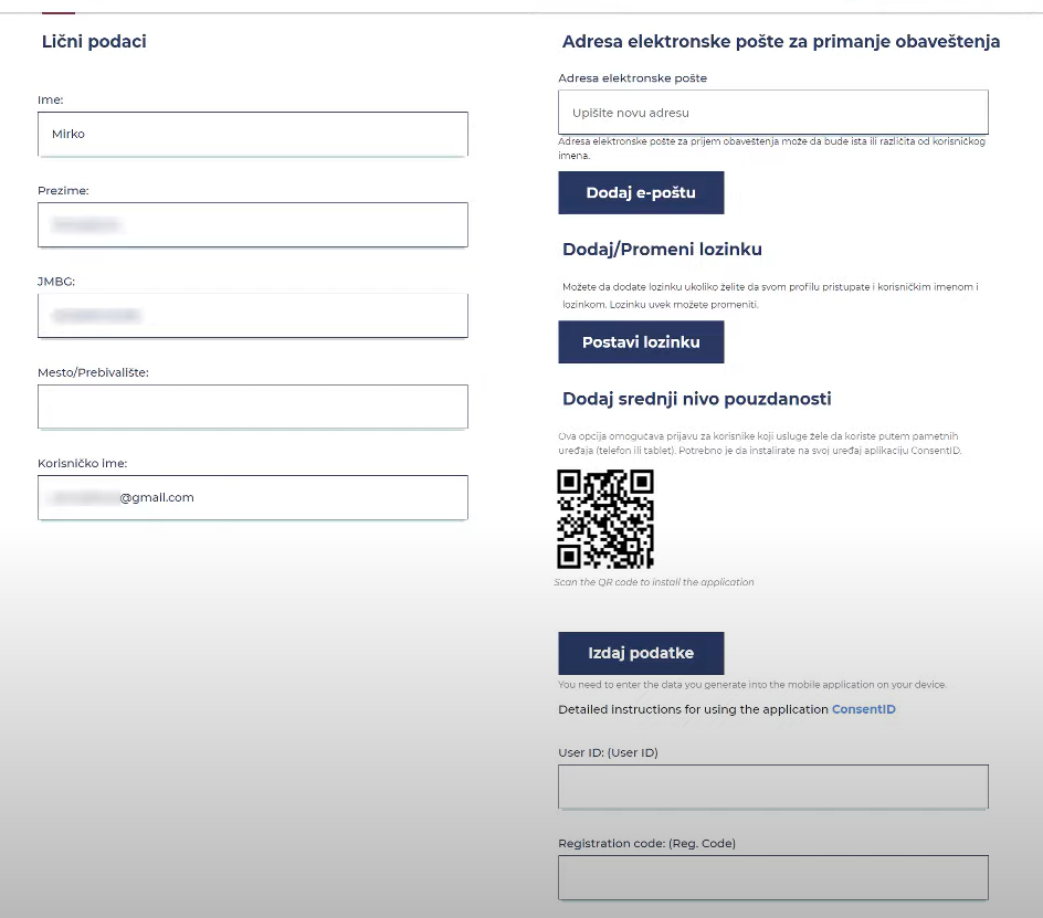 Parametre (ID korisnika i registracioni kod) možete samostalno da generišete učitavanjem kvalifikovanog elektronskog sertifikata na Portalu za elektronsku identifikaciju. Nakon uspešnog prijavljivanja prikazaće se stranice sa podacima korisničkog naloga. Odabirom opcije “Izdaj podatke” generisaće se podaci.