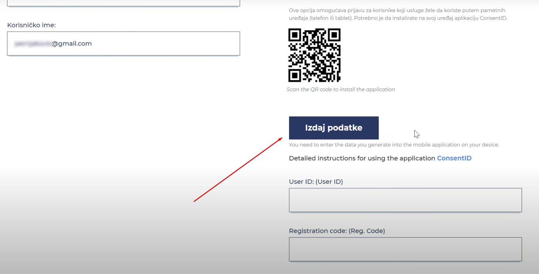 5. Odaberite opciju "Izdaj podatke" i generisaće se podaci. User ID I registracioni KOD za korišćenje mobilne aplikacije koju ćete instalirati u narednim koracima.