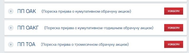 Izbor poreskih prijava za akcize, za poreske periode zaključno sa decembrom 2017. godine, se kao i do sada nalazi na portalu Poreske uprave u delu "izbor prijave":