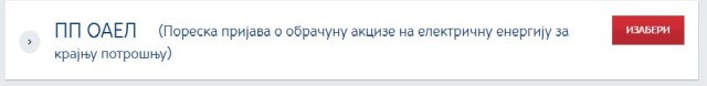 Za obračunatu akcizu na električnu energiju za krajnju potrošnju čije očitavanje potrošnje električne energije se vrši do 31. januara 2018. godine, uključujući i procenjenu ili sporazumno utvrđenu potrošnju električne energije, odnosno konačno obračunatu akcizu na električnu energiju za decembar 2017. godine, poreska prijava o obračunu akcize na električnu energiju za krajnju potrošnju podnosi se na Obrascu PP OAEL na dosadašnjem obrascu i na dosadašnji način, a izbor poreske prijave se nalazi na portalu Poreske uprave u delu "izbor prijave":