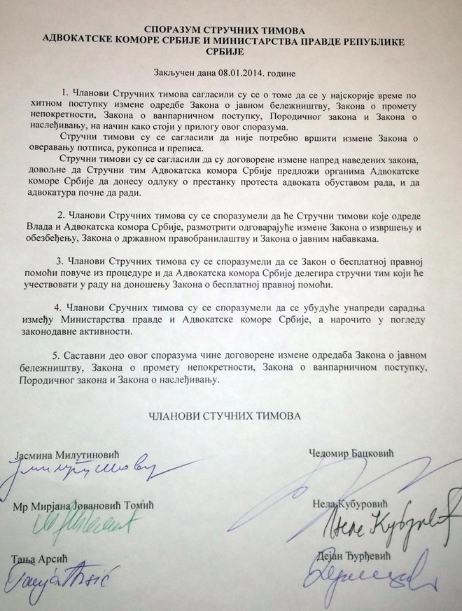 Stručni timovi Ministarstva pravde i Advokatske komore Srbije (AKS) danas su dogovorili izmene Zakona o javnom beležništvu i pratećeg seta zakona, što je jedan od zahteva srpske advokature za prekid protesta koji je započela 17. septembra prošle godine.