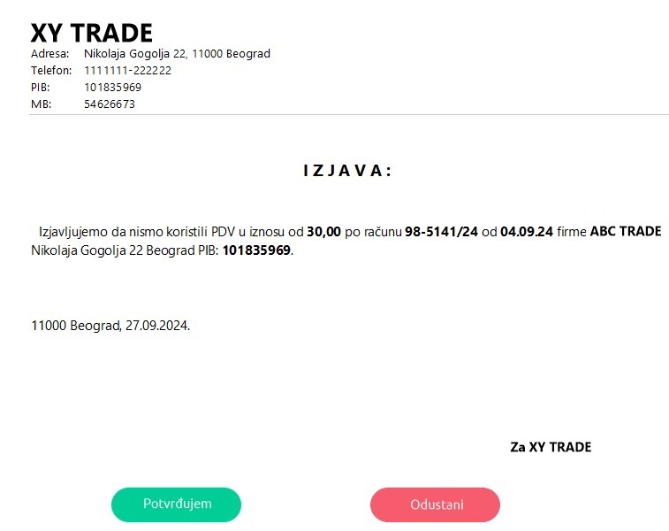 Ovo polje se popunjava kada kupac potvrdi da nije koristio PDV po tom dokumentu. Na primer, posle slanja fakture primeti se greška i prodavac stornira fakturu. Kupac tada dobija novu opciju na toj fakturi “Izjava” preko koje može dati izjavu da po tom dokumentu nije korišćen PDV: