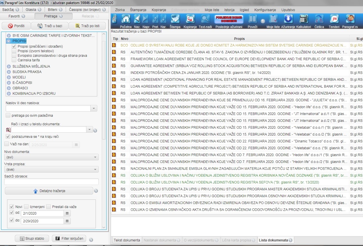 INSTRUKCIJA ZA KORIŠĆENJE PRAVNE BAZE: Pretraga propisa koji su u februaru 2020. godine stupili na snagu, objavljeni, izmenjeni ili su prestali da važe