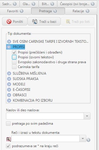 1. KORAK: izaberite opciju Pretraga i tip dokumenta Propisi i štiklirajte opciju "prečišćeni i obrađeni".