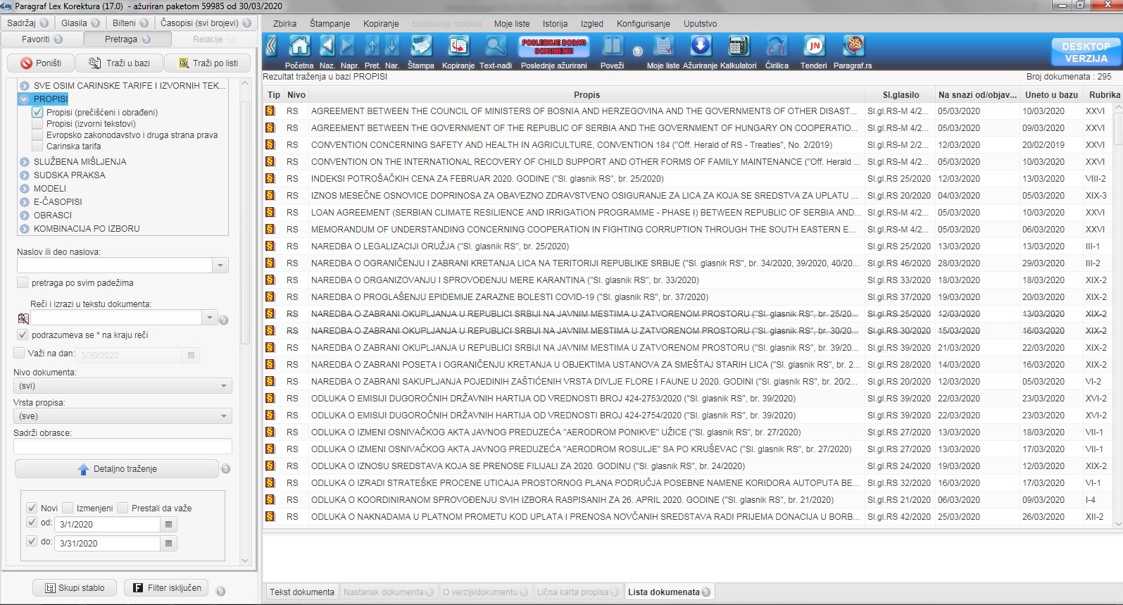 INSTRUKCIJA ZA KORIŠĆENJE PRAVNE BAZE: Pretraga propisa koji su u martu 2020. godine stupili na snagu, objavljeni, izmenjeni ili su prestali da važe