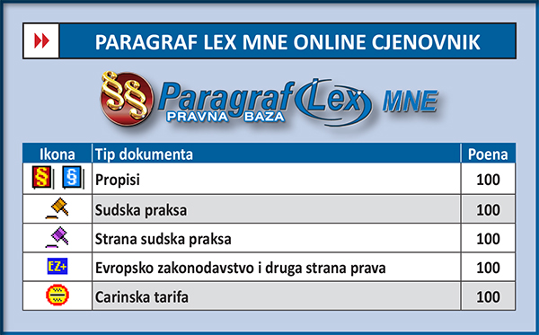 Paragraf Lex cjenovnik prikazuje pojedinačnu vrijednost dokumenata u okviru pravne baze i značajan je za njene pretplatnike. Otvaranjem jednog dokumenta ukupan saldo pretplatnika se umanjuje za vrijednost tog dokumenta.
