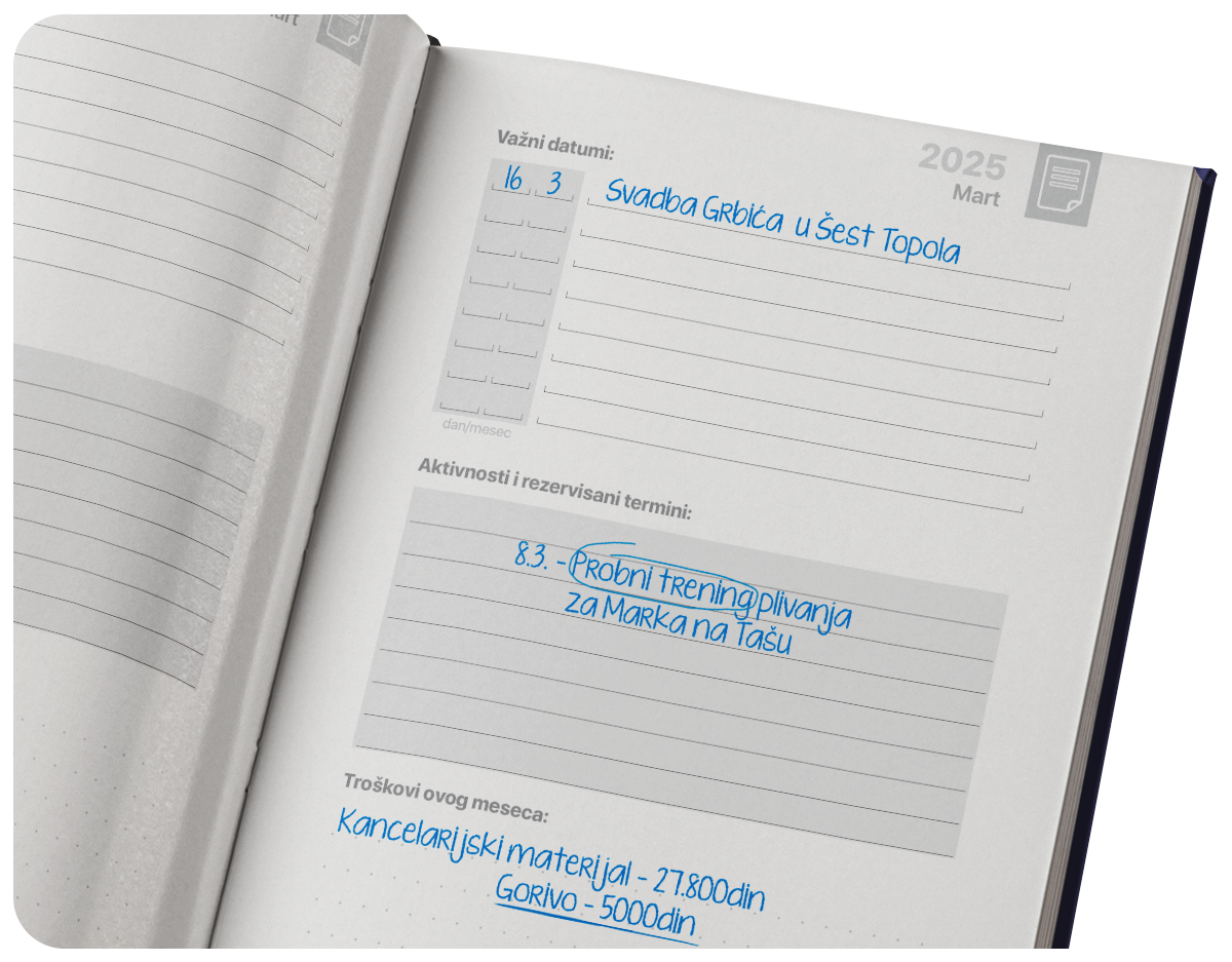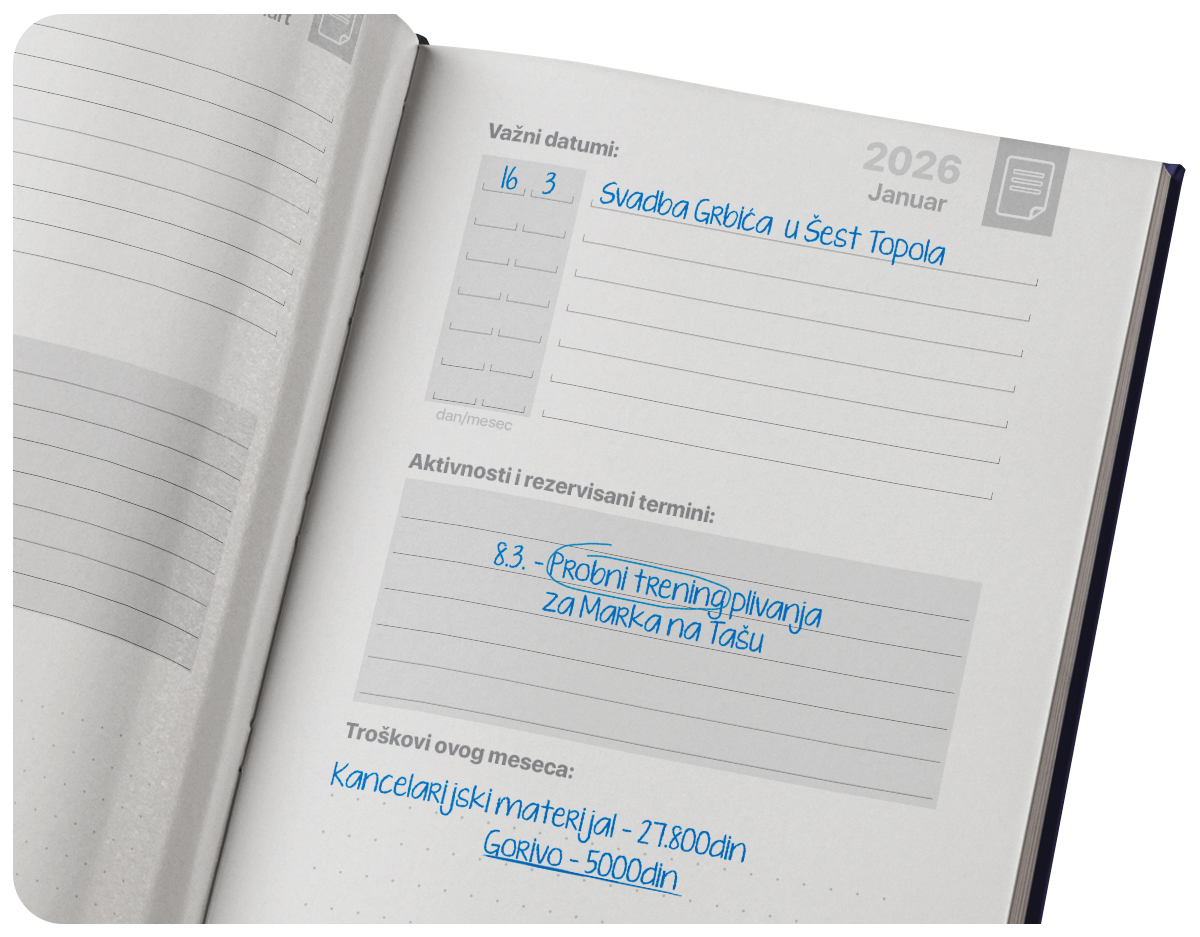 Pored toga, na početku svakog meseca izdvojili smo prostor za važne datume, rezervacije i mesečne troškove – sve što vam treba za pregledan i organizovan mesec. Vodimo računa o ravnoteži između privatnog i poslovnog: svaka stranica uz dnevni raspored sadrži i lični odeljak, tako da ćete lakše pronaći trenutke za sebe.