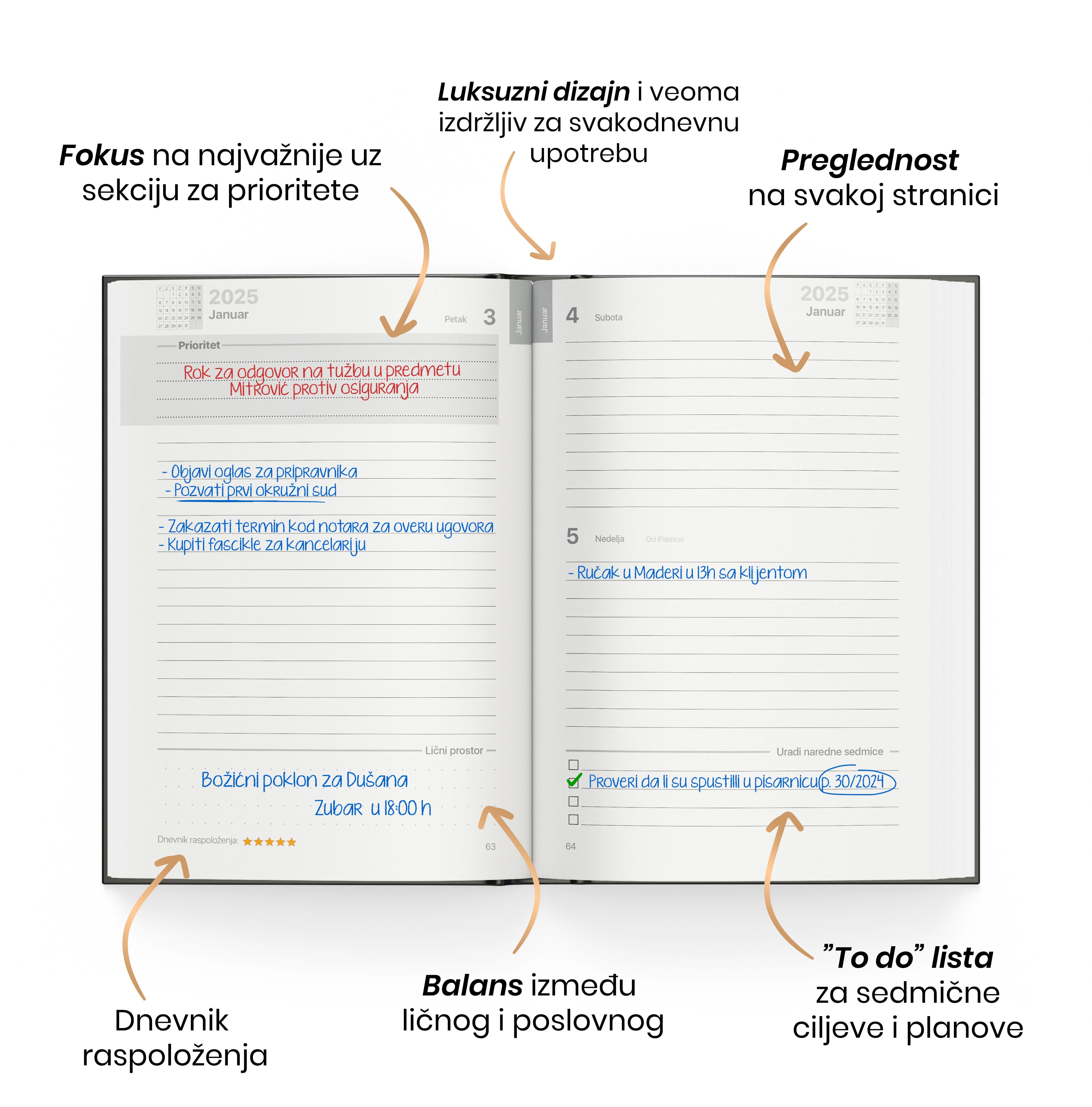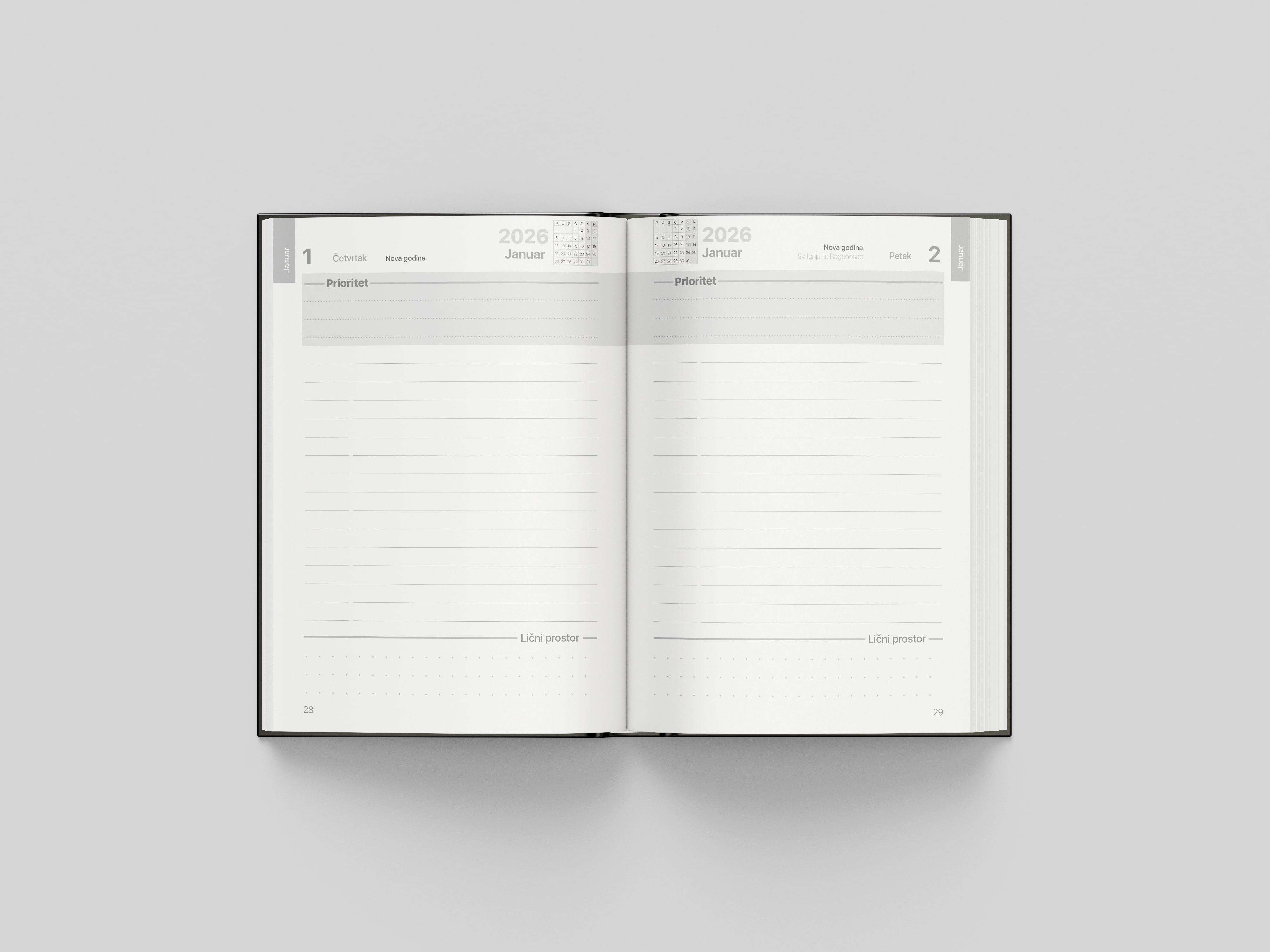 Planirajte pametnije uz sekciju za prioritete, nikad ne izgubite iz fokusa svoj raspored uz dovoljno mesta za beleženje dnevnih poslovnih obaveza, organizujte misli i zadatke uz prostor za lične beleške.