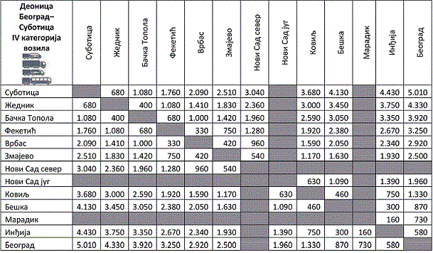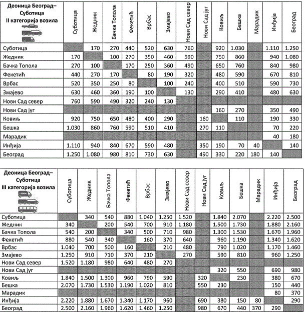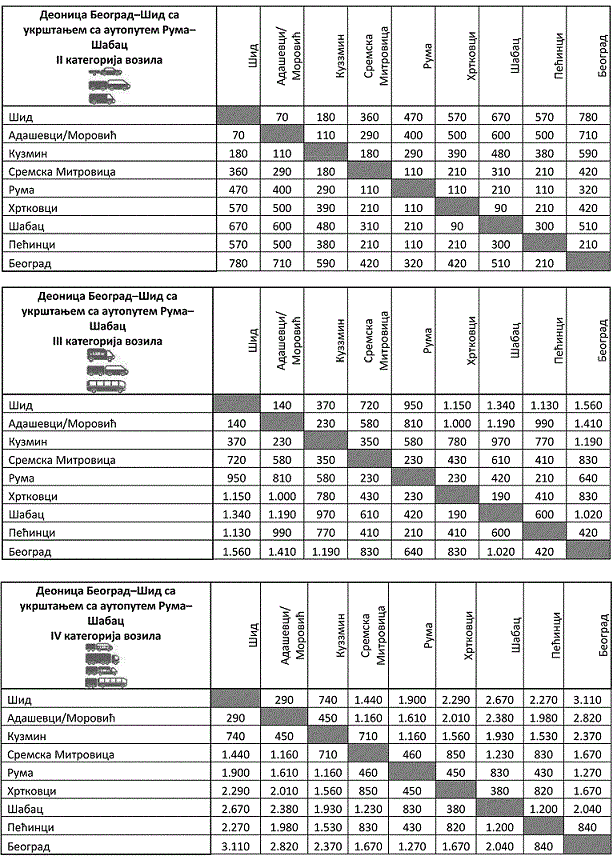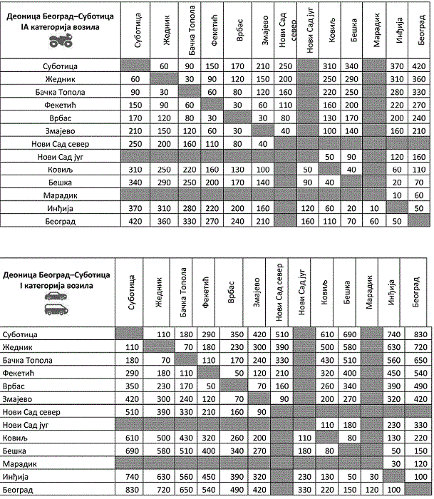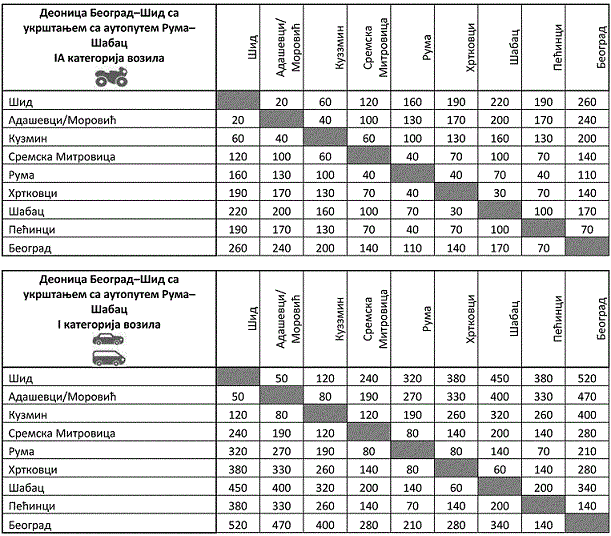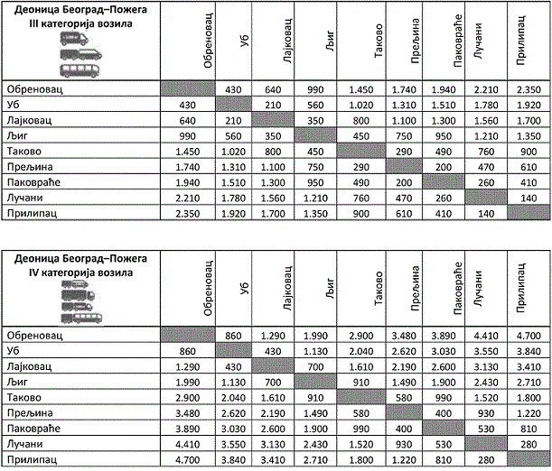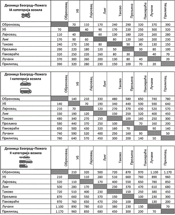 Iznose visine posebne naknade za upotrebu javnog puta, njegovog dela i putnog objekta (putarina) u zavisnosti od kategorije vozila i karakteristične deonice auto-puta za deonicu Beograd - Preševo - Dimitrovgrad sa ukrštanjem sa Moravskim koridorom za IA, I, II, III i IV kategoriju vozila, možete pogledati OVDE