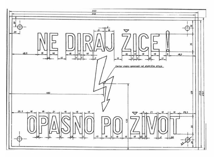 14) na zaštitne kapije koje se nalaze na putu ispred putnog prelaza, zbog mogućeg opasnog uticaja kontaktne mreže iznad koloseka, postavljaju se table za upozorenje učesnika u drumskom saobraćaju na visoki napon, čiji je izgled dat u Prilogu 1 - Table na putnom prelazu sa upozorenjem na visoki napon od 25.000 V u neizolovanoj kontaktnoj mreži iznad elektrificiranog železničkog koloseka, koji je odštampan uz ovaj pravilnik i čini njegov sastavni deo.