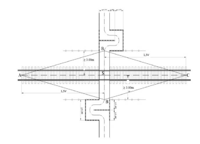 A i C - mesto vidljivosti na pruzi udaljeno od pešačkog ili biciklističkog prelaza, na kome učesnik u pešačkom saobraćaju sa mesta vidljivosti na pešačkoj ili biciklističkoj stazi ima mogućnost da pouzdano uoči dolazeće železničko vozilo iz tačke B i da stane pre izlaska iz mimoilaznice na stazu preko koloseka. Mesto vidljivosti određuje se izračunavanjem puta približavanja železničkog vozila.