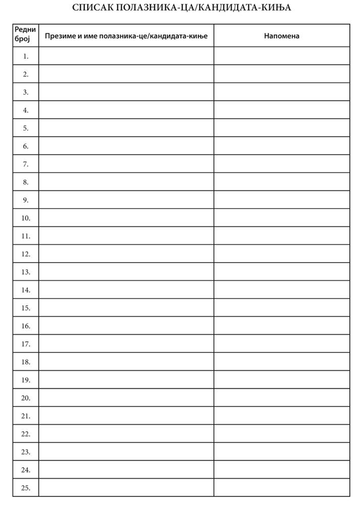 Broj unutrašnjih listova odgovara broju polaznika, odnosno kandidata.