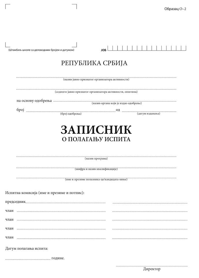 Evidencija o ispitu vodi se na Obrascu O-2, veličine 21 x 29,5 cm, na 80-gramskoj hartiji, a kada se štampa i izdaje dvojezično iste je veličine.