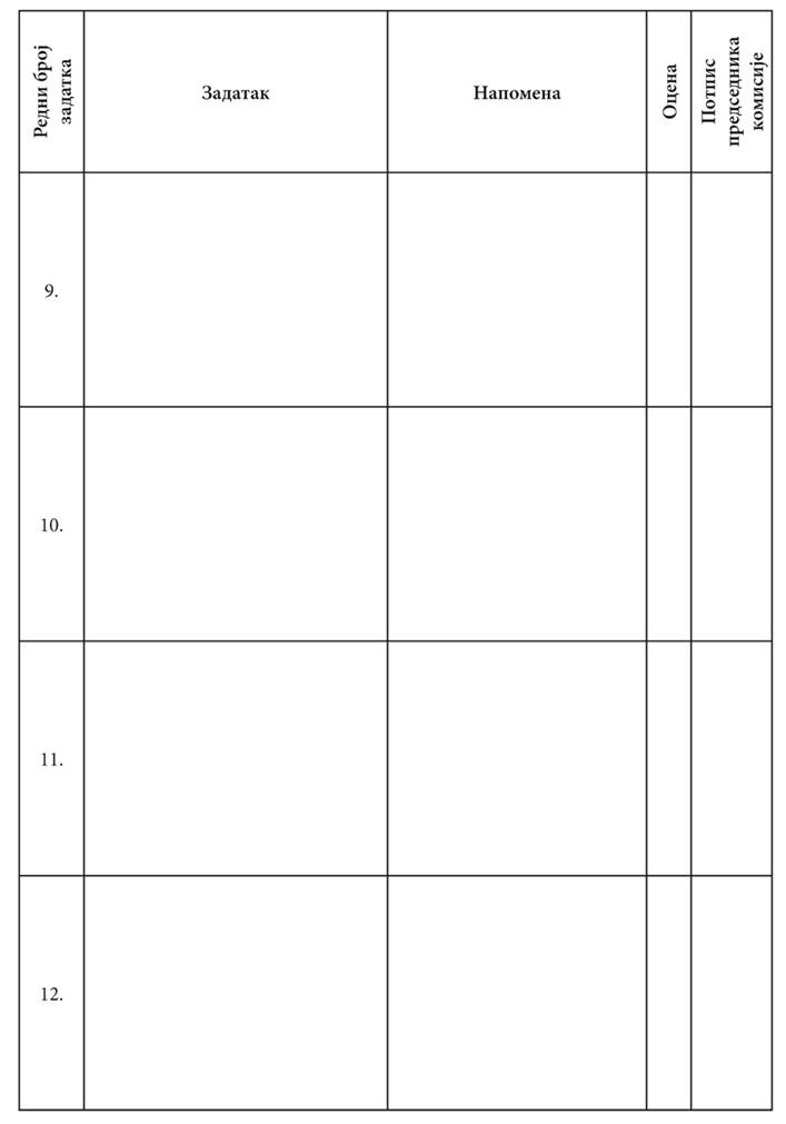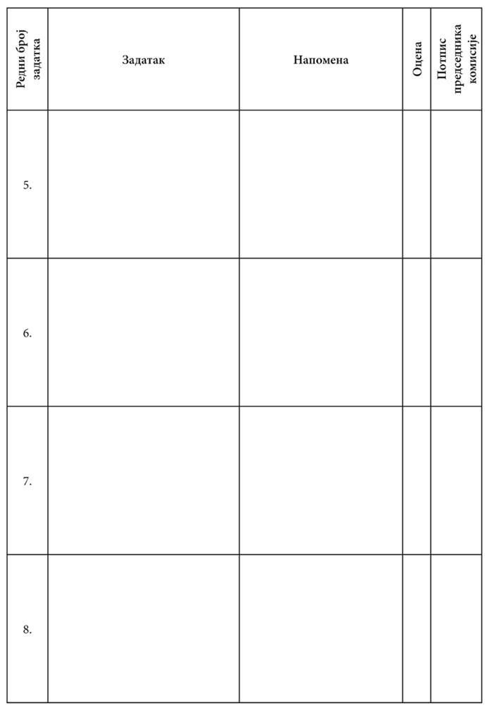 4) ispitu (datum polaganja, mesto za potpis članova ispitne komisije, delovodni broj zapisnika, naziv zadataka na ispitu i prostor za njihovo rešavanje).