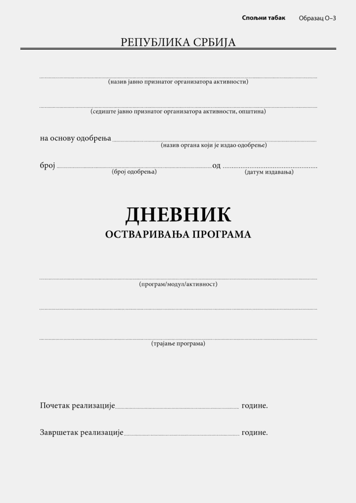 Dnevnik ostvarivanja programa iz stava 1. ovog pravilnika, vodi se na Obrascu O-3, u obliku spoljnjeg tabaka i unutrašnjih listova, veličine 21 x 29,5 cm, na 100-gramskoj hartiji, a kada se štampa i izdaje dvojezično iste je veličine.