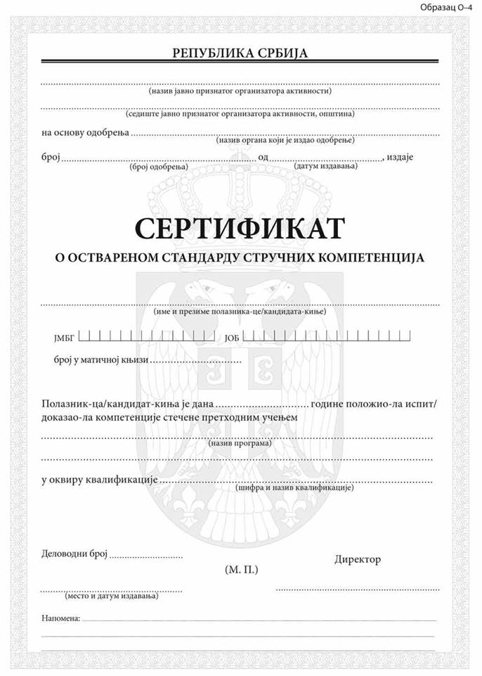 Obrazac sertifikata za ostvarni standard stručnih kompetencija, JPOA izdaje polazniku, odnosno kandidatu na Obrascu O-4, u obliku lista veličine 245x345 mm, na 200-gramskom sigurnosnom papiru svetložute boje, sa vodenim žigom, sa punom hemijskom zaštitom i sigurnosnim vlaknima, sa Malim grbom Republike Srbije u pozadini teksta i okvirom svetloplave boje na prednjoj strani, a kada se štampa i izdaje dvojezično iste je veličine. Na poleđini obrasca upisuju se stečene stručne kompetencije i jedinice kompetencije.