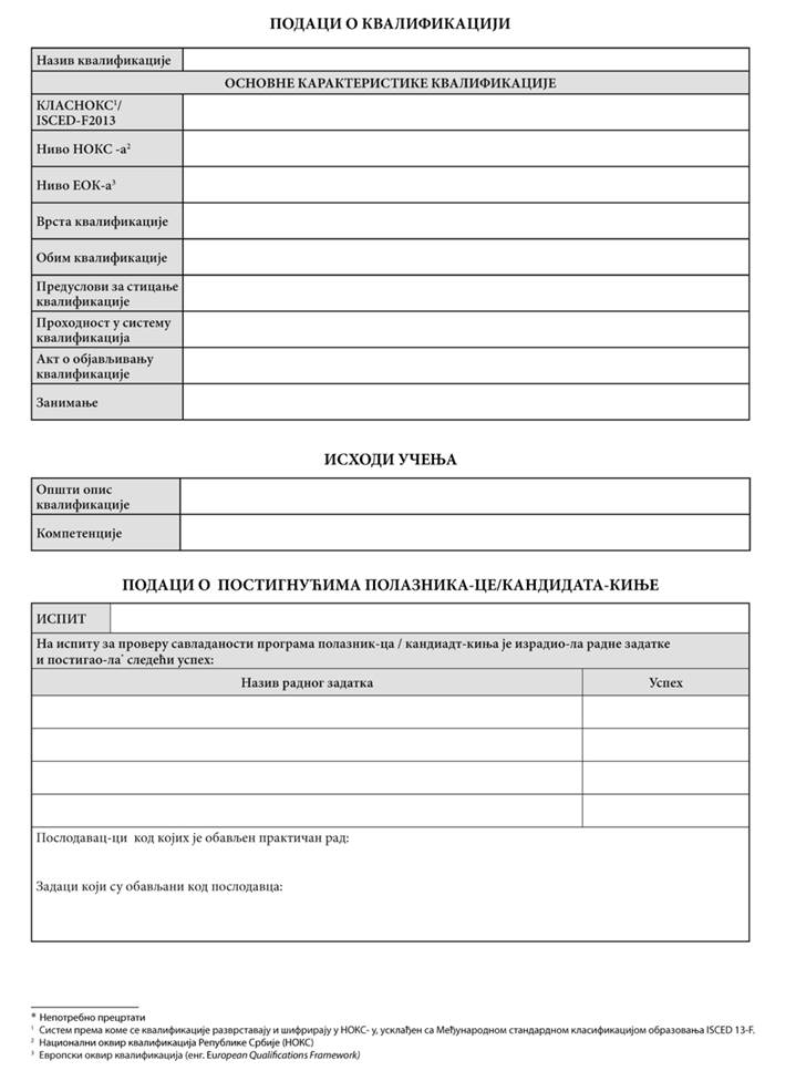 Obrazac sertifikata za ostvarni standard kvalifikacije u celini, JPOA izdaje polazniku, odnosno kandidatu na Obrascu O-5, u obliku lista veličine 245x345 mm, na 200-gramskom sigurnosnom papiru svetložute boje, sa vodenim žigom, sa punom hemijskom zaštitom i sigurnosnim vlaknima, sa Malim grbom Republike Srbije u pozadini teksta i okvirom svetloplave boje na prednjoj strani, a kada se štampa i izdaje dvojezično iste je veličine. Na poleđini obrasca upisuju se stečene stručne kompetencije i jedinice kompetencije.