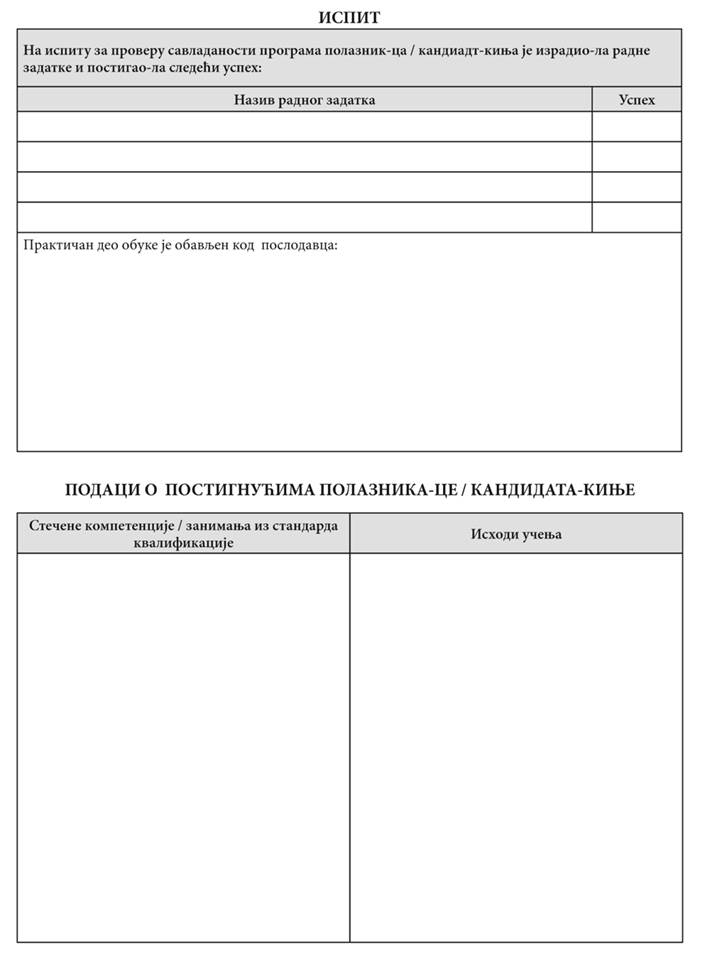 4) ispitima (podaci o ispitu kojim se dokazuje sticanje kvalifikacije, ključnih ili stručnih kompetencija i zapisnik o toku ispita);