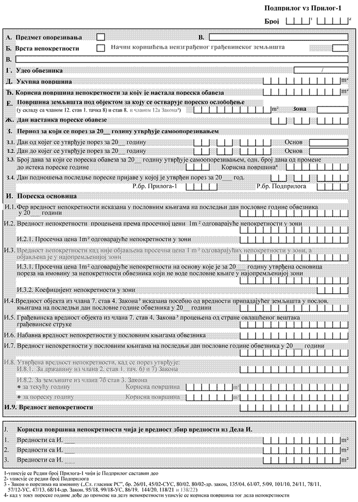 Sastavni deo Priloga-1 je Obrazac Podprilog uz Prilog-1 (u daljem tekstu: Podprilog), koji se popunjava na zasebnom primerku za neizgrađeno zemljište, odnosno na zasebnom primerku za svaki objekat i zasebnom primerku za pripadajuće zemljište na kome se, odnosno ispod koga se nalazi objekat, za koji se utvrđuje porez u Prilogu-1 (tako da broj Podpriloga odgovara broju objekata na koje se porez plaća koji se nalaze na ili ispod istog zemljišta, uvećan za jedan kad se porez plaća na pripadajuće zemljište).