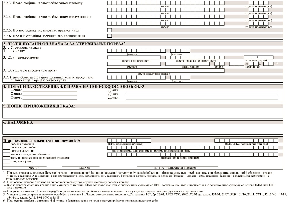 1) Obrascu PPI-4 - Poreska prijava za utvrđivanje poreza na prenos apsolutnih prava, osim na nepokretnosti (u daljem tekstu: Obrazac PPI-4) - za prenos apsolutnih prava (uključujući prenos uz naknadu celokupne imovine pravnog lica i prodaju stečajnog dužnika kao pravnog lica), osim isključivo na nepokretnosti;