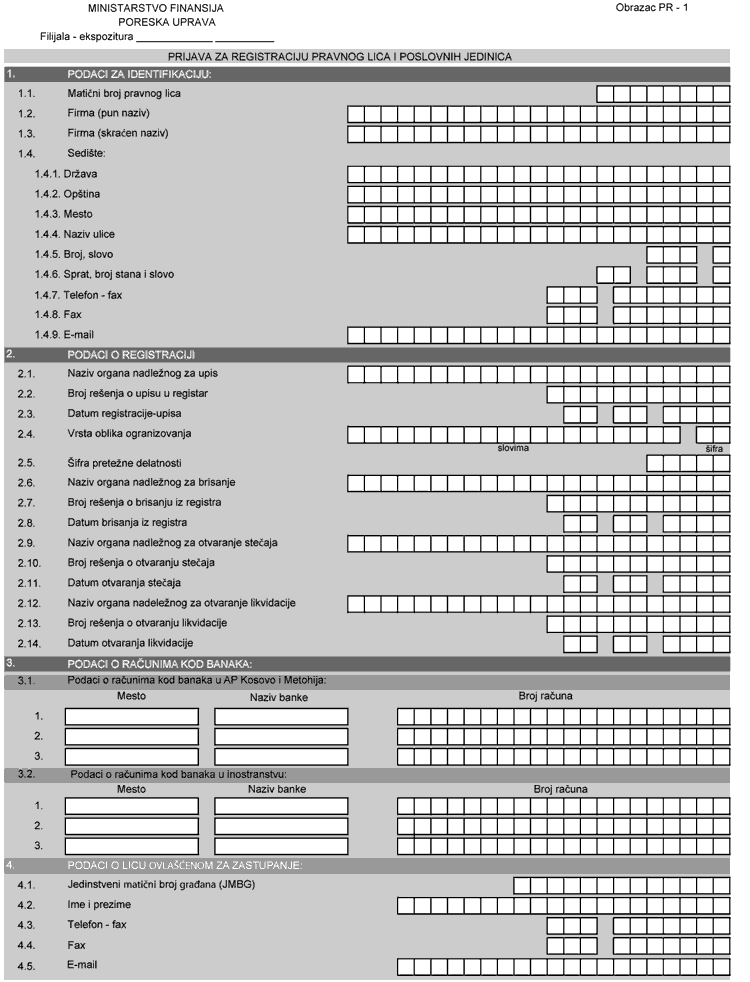 Prijavu za registraciju na Obrascu PR-1 podnose: rezidentno pravno lice; državni organ i organizacija; organ i organizacija teritorijalne autonomije ili lokalne samouprave bez svojstva pravnog lica; stalna poslovna jedinica nerezidentnog pravnog lica; nerezidentno pravno lice i sva ostala rezidentna i nerezidentna lica koja nemaju svojstvo fizičkog lica, odnosno preduzetnika za čiju registraciju nije nadležna Agencija.