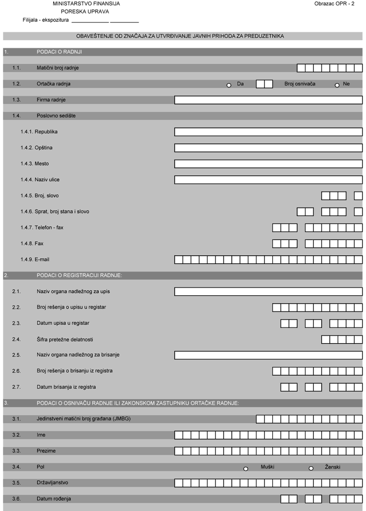 Organ nadležan za upis u odgovarajući javni registar izuzev Agencije, dužan je da Centrali Poreske uprave, po izvršenom upisu u registar subjekta upisa, promena upisa ili brisanje subjekta upisa iz registra, dostavi obaveštenje na Obrascu OPR-1 - Obaveštenja od značaja za utvrđivanje javnih prihoda za pravna lica, Obrascu OPR-2 - Obaveštenje od značaja za utvrđivanje javnih prihoda za preduzetnika i Obrascu OPR-3 - Obaveštenje od značaja za utvrđivanje javnih prihoda za fizičko lice nerezidenta, koji su odštampani uz ovaj pravilnik i čine njegov sastavni deo.