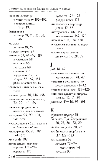 Pred tobom je jedna strana indeksa iz Gramatike srpskog jezika za osnovnu školu. Pažljivo je pogledaj i odgovori na postavljeno pitanje.