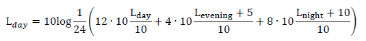 Nivo buke za dan-veče-noć Lden, u decibelima dB(A) definiše se sledećom jednačinom:
