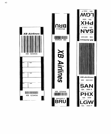 a) Nalepnica ima najmanje 5 mm široku zelenu traku po celoj dužini dva ruba odeljaka na kojima se navodi putovanje i podaci za identifikaciju. Nadalje, zelene trake mogu se protezati i na druge delove nalepnice za prtljag, osim na ona područja na kojima je prikazan barkod nalepnice, koji mora biti otisnut na čistoj beloj podlozi (videti uzorke u tački 2. pod a));