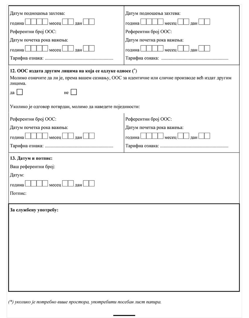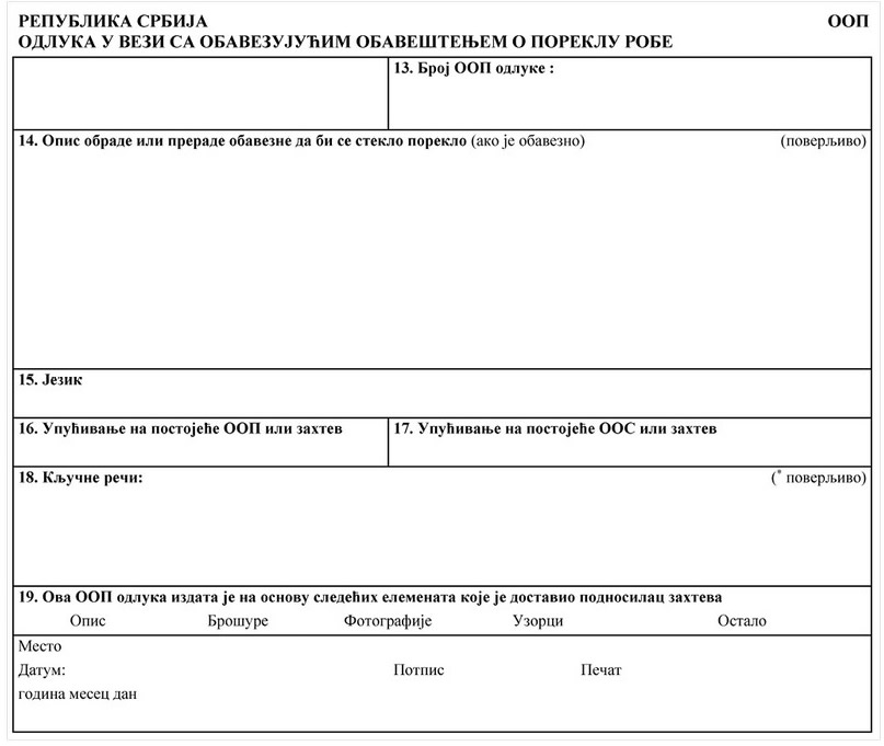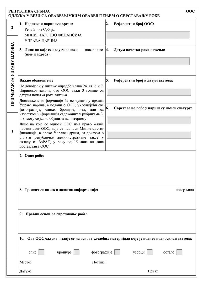 ZAHTEV ZA IZDAVANJE OBAVEZUJUĆEG OBAVEŠTENJA O SVRSTAVANJU ROBE (OOS)