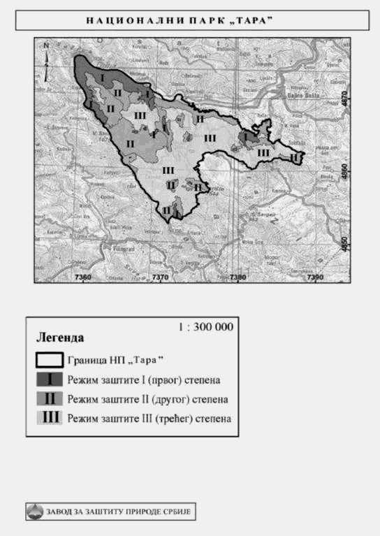 Područje Nacionalnog parka "Tara" prostire se na teritoriji opštine Bajina Bašta, u okviru 10 katastarskih opština: Jagoštica, Rastište, Zaovine, Konjska reka, Perućac, Beserovina, Zaugline, Rača, Mala reka i Solotuša, ukupne površine 24.991,82 ha, od čega je 13.588,51 ha u državnoj svojini, a u privatnoj i drugim oblicima svojine 11.403,36 ha, od čega je I stepenom obuhvaćeno 13,35%, II stepenom 34,07% i III stepenom 52,58% ukupne površine, na dan stupanja na snagu ovog zakona.